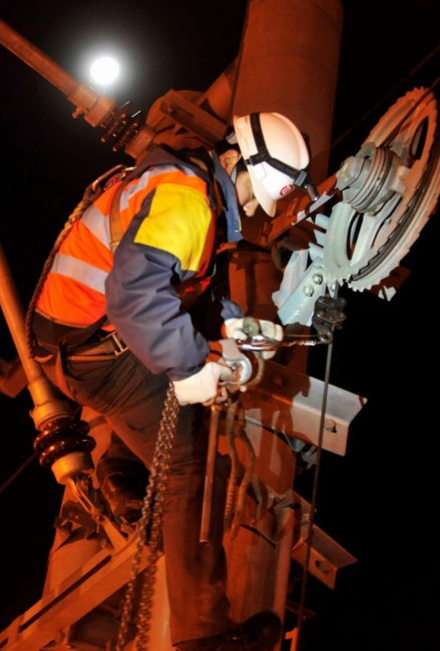 圖中,我們可以看出,天已經完全黑了下來,劉師傅還在10米的高空中,使用手扳葫蘆對重達400公斤的墜砣進行調整,可謂是十分辛苦。但是為了保障我們生活中的電力,他們只能這樣做,真的是謝謝他們啦。